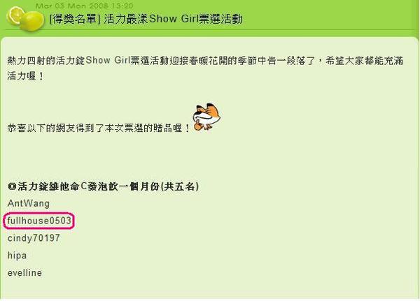 其實我都忘了我有參加這個活動了,因為印象中好像也沒投幾次票,可能是老天爺看我最近比較操勞,要我多注意身體,補充一下維他命C吧,中獎的感覺還真是不錯,感覺好運又開始回來了,希望就這樣一直好運下去吧!